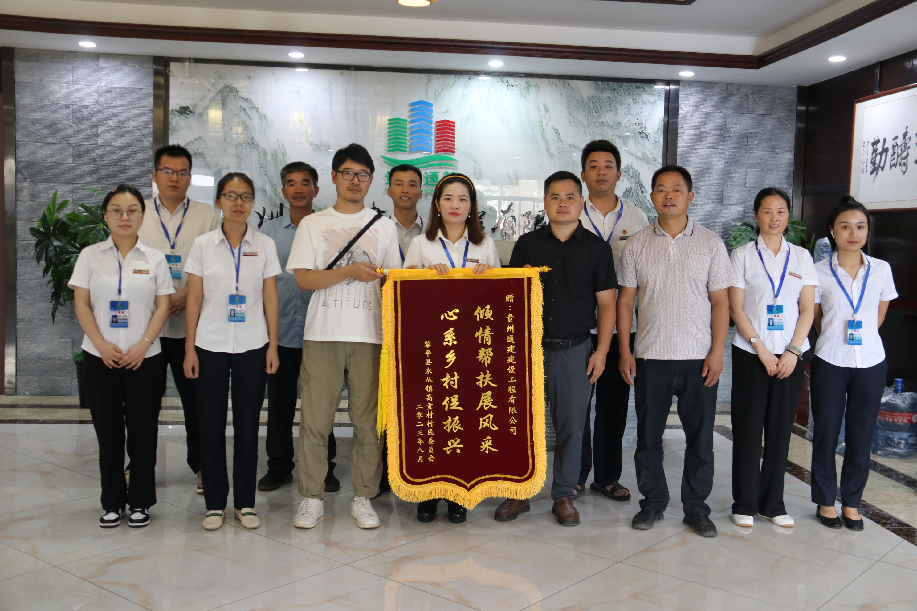 2023年8月4日上午,黎平县永从镇高贡村驻村第一书记秦周斌、村支书陆家高、村监委陆家宏等一行专程来到贵州通建建设工程有限公司,代表永从镇高贡村村民委员会及高贡村的父老乡亲,将一面印有“倾情帮扶展风采,心系乡村促振兴”的锦旗,亲手赠送到贵州通建建设工程有限公司常务副总经理吴香柳、总经理助理付金成手中,以感谢贵州通建公司在和美城乡“四大行动”中对高贡村的倾情帮扶、助力乡村振兴、办实事、做好事、解难事表达最诚挚的谢意。